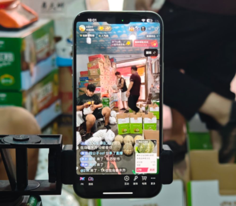 穩穩抱起一顆瓜,單手託好,用塑料發泡網整個套住,再確保邊角捂嚴捂緊,最後挨個慢慢放進紙箱,打上捆紮帶,一箱老漢瓜便做好了“起飛”準備。水果店裏,阿卜杜拉·阿卜杜熱依木一會兒在手機屏幕前滔滔不絕,一會兒又忙着打包顧客下單的甜瓜。直播間裏滿是“甜蜜”。