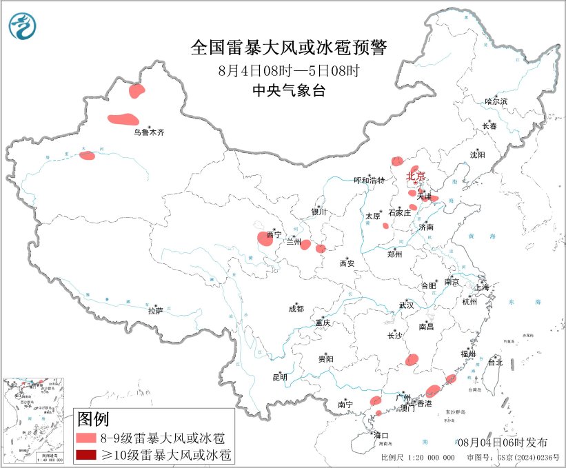 預計8月4日08時至5日08時,西北地區中東部、華北中北部、華南南部等地的部分地區將有8級以上雷暴大風或冰雹天氣;西北地區中東部、華北、江南南部和東部、華南中東部等地的部分地區將有小時雨量大於20毫米的短時強降水天氣,其中,河北中部和東北部、北京西南部、廣東西北部和中南部等地的部分地區小時雨量大於50毫米,最大可達80毫米以上。