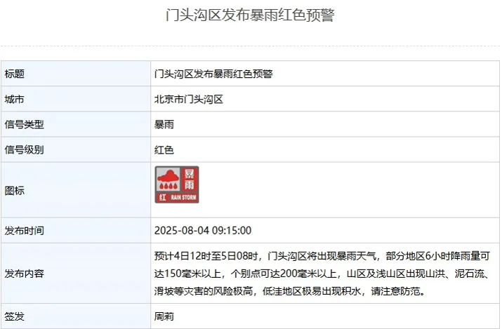 房山區發佈暴雨紅色預警