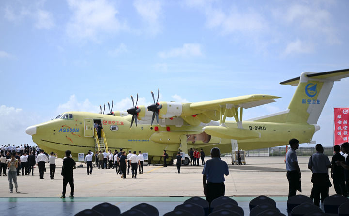 2025年6月11日在珠海中航通飛華南飛機工業有限公司拍攝的批量生產的首架AG600飛機。當日,大型水陸兩棲飛機AG600“鯤龍”獲頒中國民航局生產許可證,標誌着AG600飛機正式邁入批量生產階段。新華社記者 鄧華 攝