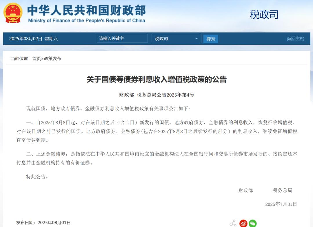 【環球網財經綜合報道】8月1日,財政部、税務總局公告,自2025年8月8日起,對在該日期之後(含當日)新發行的國債、地方政府債券、金融債券的利息收入,恢復徵收增值税。對在該日期之前已發行的國債、地方政府債券、金融債券(包含在2025年8月8日之後續發行的部分)的利息收入,繼續免徵增值税直至債券到期。
