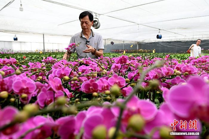 7月16日,台胞王耀宗在位於福建漳州市南靖縣的天農蘭花園裏查看蝴蝶蘭長勢。中新網記者 呂明 攝