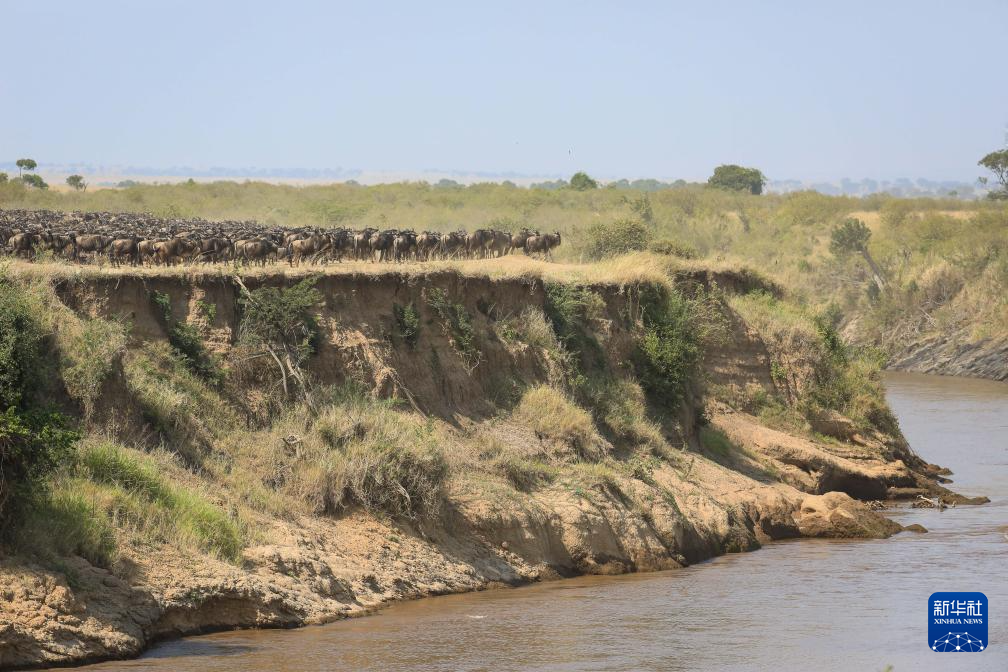 7月30日,在肯尼亞馬賽馬拉國家保護區,成羣的角馬聚集在馬拉河邊準備渡河。新華社記者 韓旭 攝