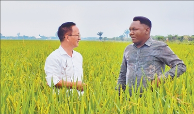楊華德(左)在田間向當地種植户講解水稻種植技術。