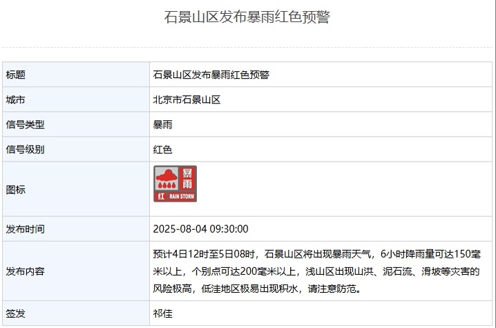 預計4日12時至5日08時,石景山區將出現暴雨天氣,6小時降雨量可達150毫米以上,個別點可達200毫米以上,淺山區出現山洪、泥石流、滑坡等災害的風險極高,低窪地區極易出現積水,請注意防範。