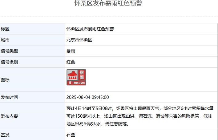 預計4日14時至5日08時,懷柔區將出現暴雨天氣,部分地區6小時累積降水量可達150毫米以上,淺山區出現山洪、泥石流、滑坡等災害的風險極高,低窪地區極易出現積水,請注意防範。