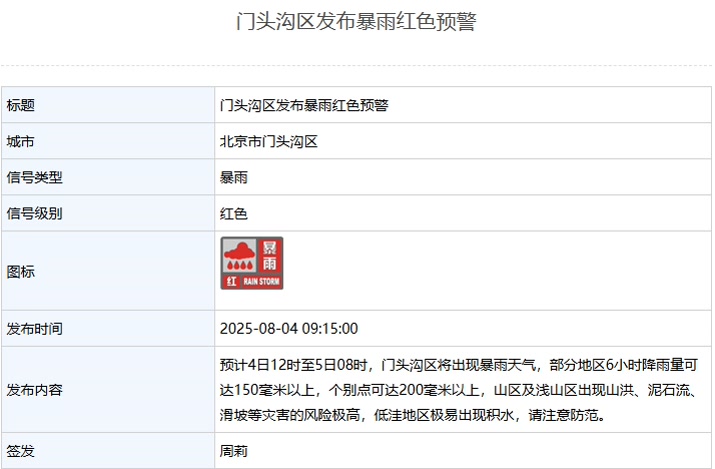 預計4日12時至5日08時,門頭溝區將出現暴雨天氣,部分地區6小時降雨量可達150毫米以上,個別點可達200毫米以上,山區及淺山區出現山洪、泥石流、滑坡等災害的風險極高,低窪地區極易出現積水,請注意防範。