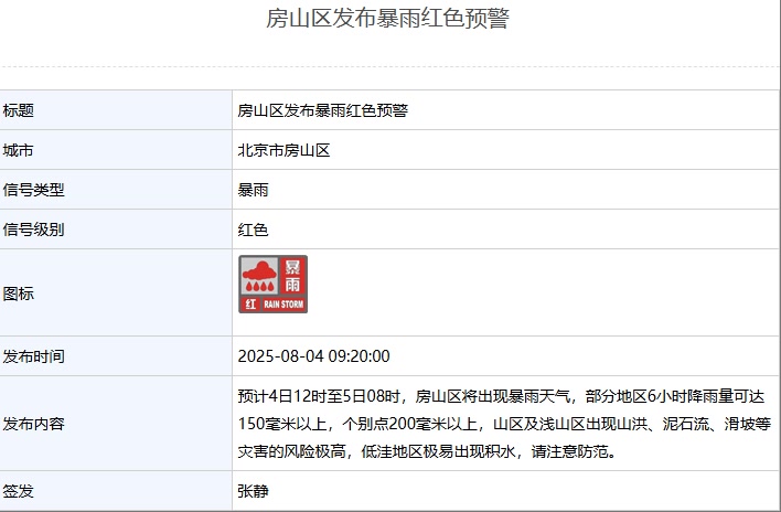 預計4日12時至5日08時,房山區將出現暴雨天氣,部分地區6小時降雨量可達150毫米以上,個別點200毫米以上,山區及淺山區出現山洪、泥石流、滑坡等災害的風險極高,低窪地區極易出現積水,請注意防範。