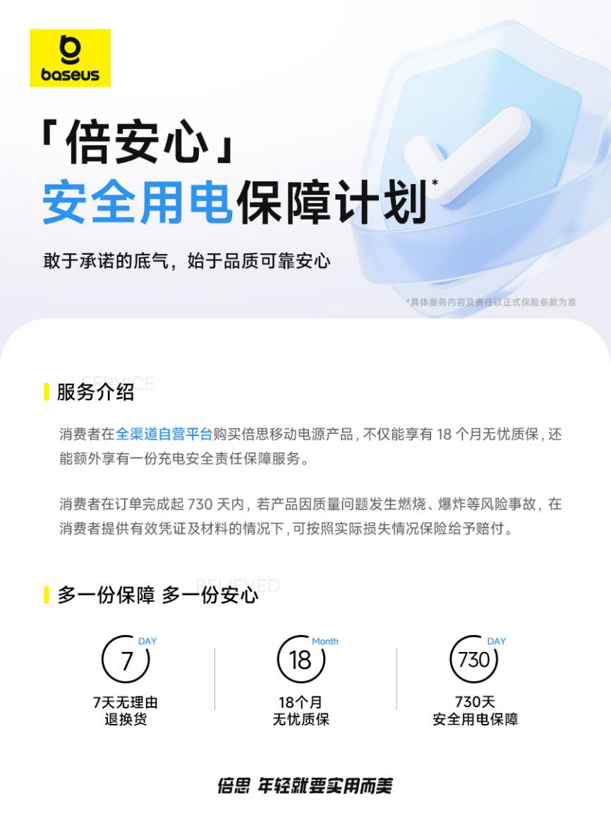 在“倍安心”安全用電保障計劃下,消費者購買倍思移動電源產品,不僅可以享有18個月無憂質保,還能獲贈一份充電安全保險。在訂單完成後的730天內,若產品因質量問題出現燃燒、爆炸等意外事故導致損失,消費者可憑相關有效憑證申請理賠,最大限度降低用户風險。
