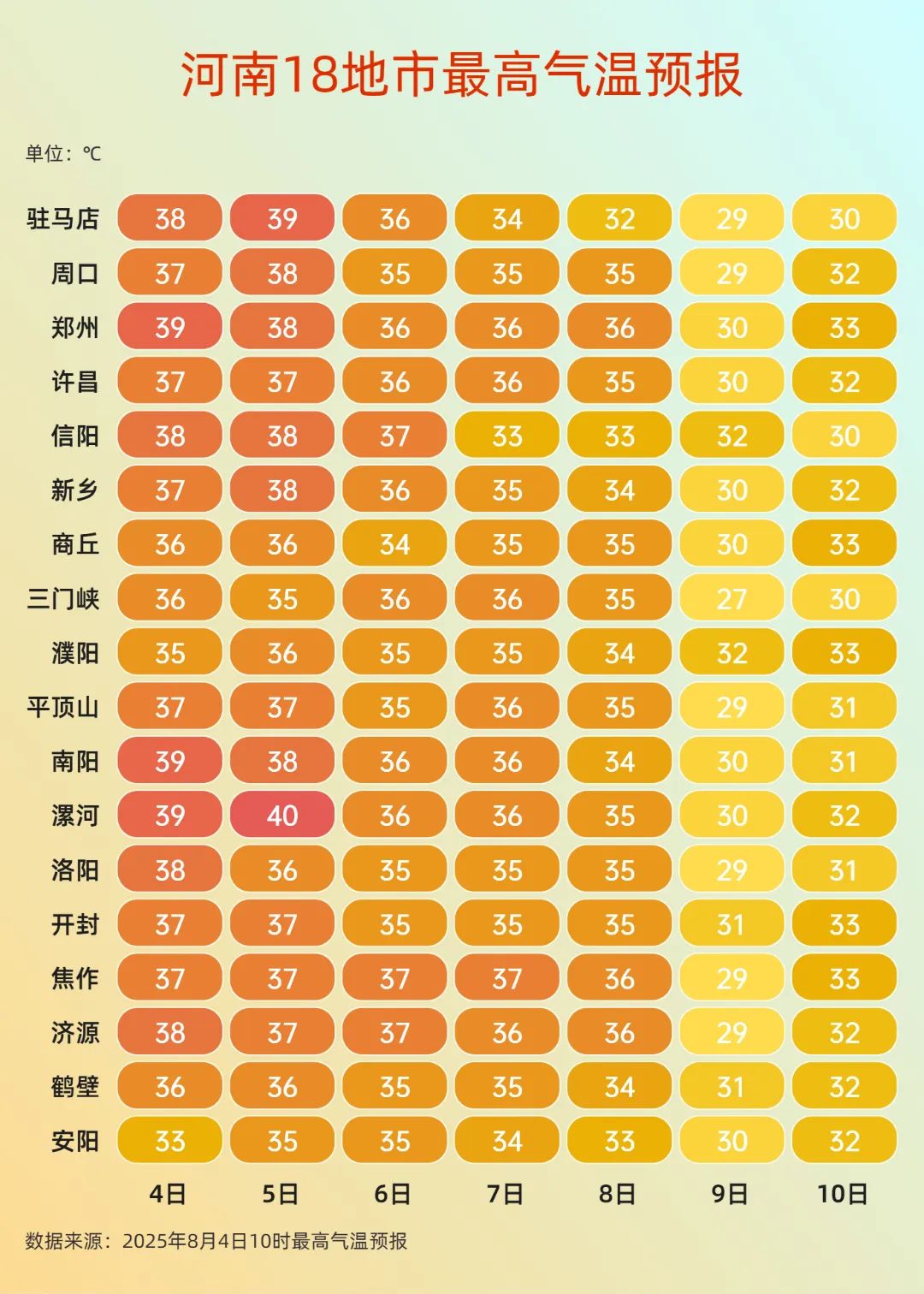 今天上午9點,河南省氣象台發佈高温橙色預警,今明兩天我省延續高温天氣,濟源、焦作、新鄉和黃河以南大部最高氣温在37℃以上,局地超過40℃。截至上午12點,河南省有12個市縣高温紅色預警生效中。