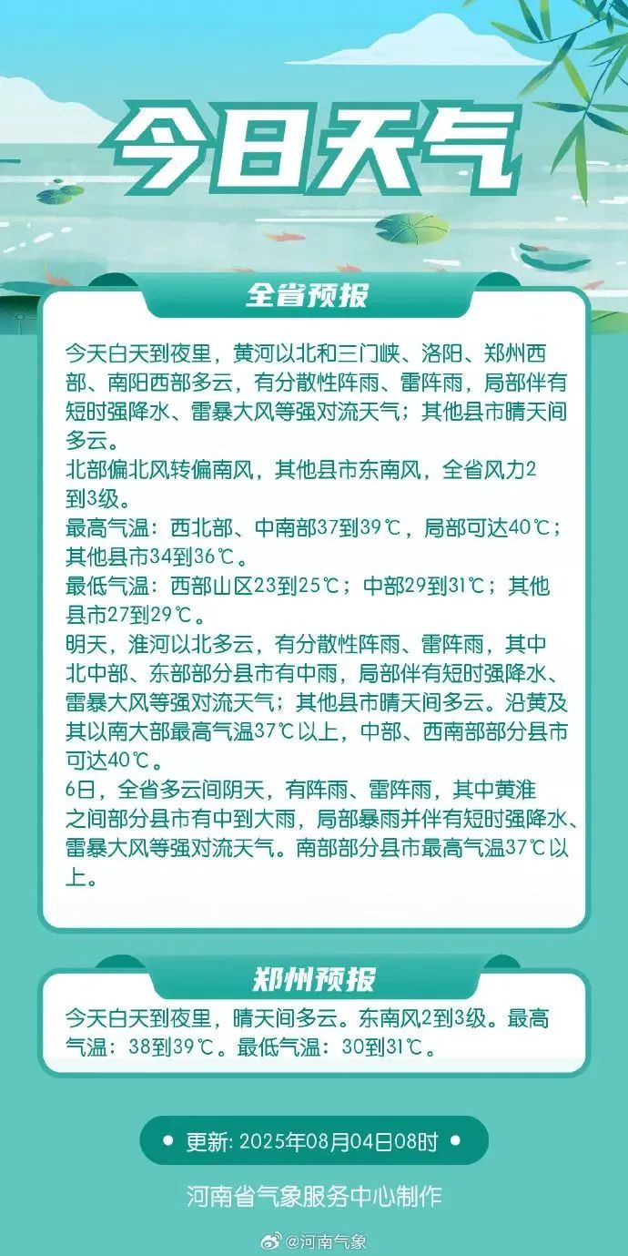 今天白天到夜裏,黃河以北和三門峽、洛陽、鄭州西部、南陽西部多雲,有分散性陣雨、雷陣雨,局部伴有短時強降水、雷暴大風等強對流天氣;其他縣市晴天間多雲。北部偏北風轉偏南風,其他縣市東南風,全省風力2到3級。最高氣温:西北部、中南部37到39℃,局部可達40℃;其他縣市34到36℃。最低氣温:西部山區23到25℃;中部29到31℃;其他縣市27到29℃。