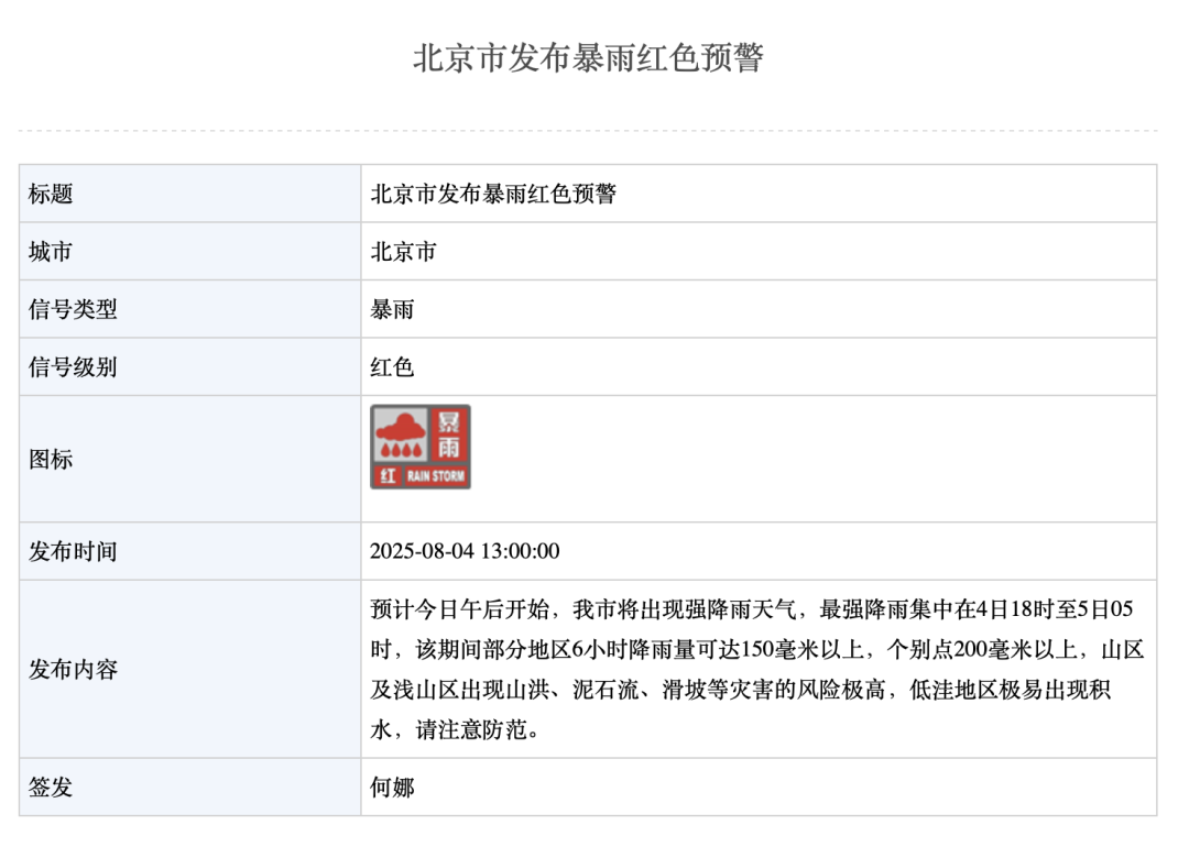 北京升級發佈暴雨紅色預警!最強降雨集中在4日18時至5日5時