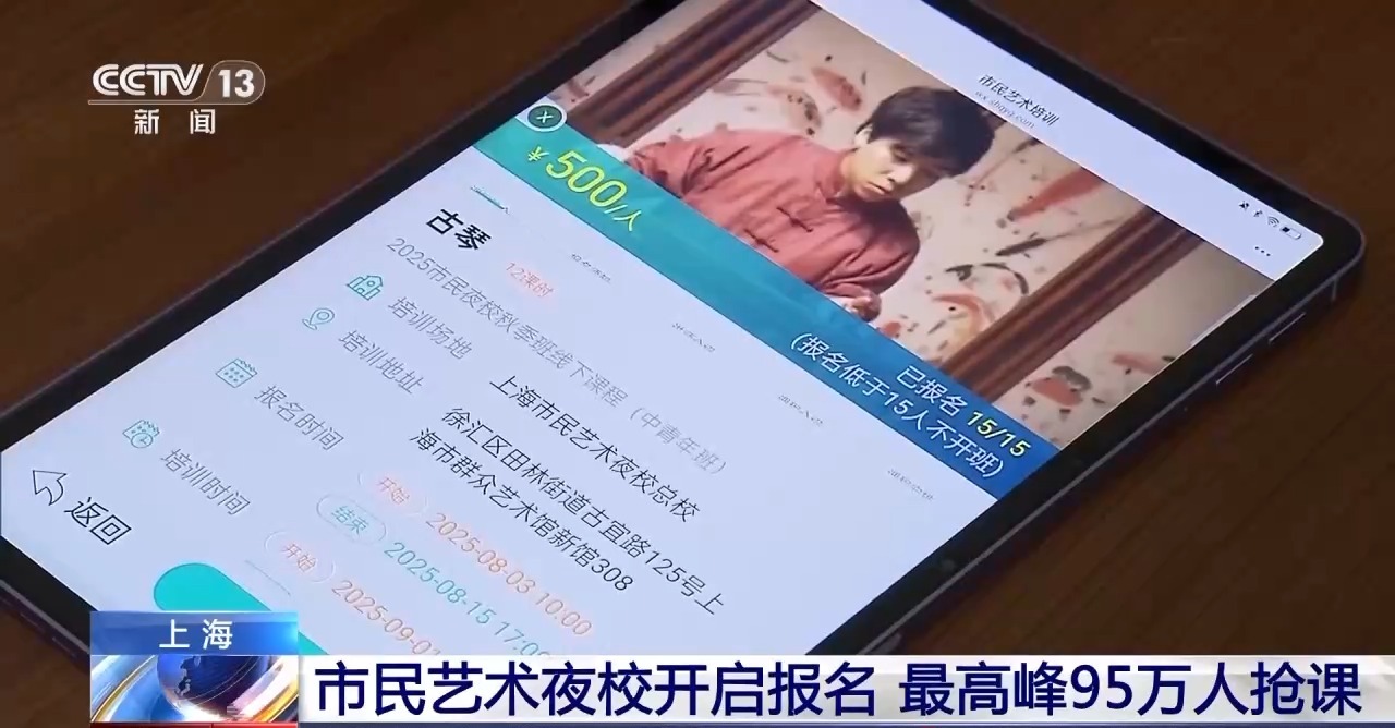 500元12節課,高性價比的上海市民藝術夜校每次報名都十分火爆。昨天上午10點,2025年上海市民藝術夜校秋季班開啓報名,2300門課程,最高峯時吸引了近95萬人同時在線**搶課。而最熱門課程,3秒就搶光了;短短5秒鐘,有8門課被搶完。