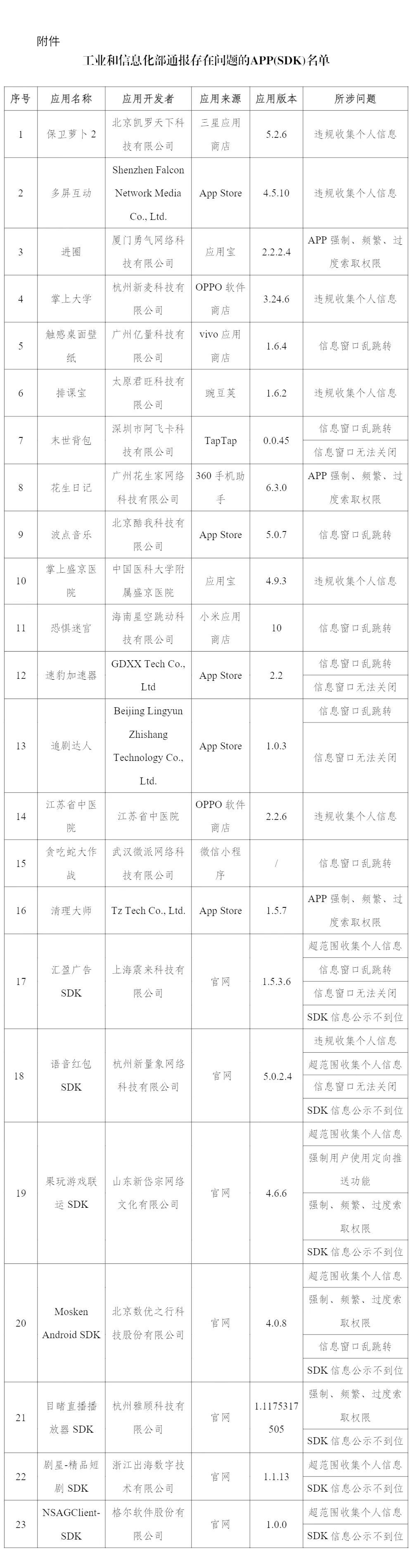 附件:工業和信息化部通報存在問題的APP(SDK)名單