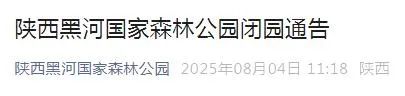 為了確保廣大遊客生命財產安全,陝西黑河國家森林公園自2025年8月4上午10:40時起執行景區惡劣天氣臨時閉園制度,禁止遊客和旅遊車輛進入景區,開園時間另行通告,感謝您的理解與配合。已購票遊客,可通過購票渠道申請退款。由此給您帶來的不便,敬請諒解。