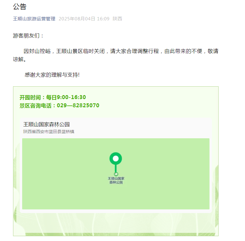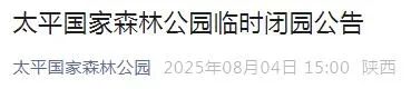 根據《周至縣防汛抗旱指揮部辦公室關於做好人員撤離、封山控峪、景點關閉工作的緊急通知》(周汛旱辦發〔2025〕26 號),8月4日午後至夜間有一次降水過程,量級以小到中雨為主,公園區域局地大到暴雨,景區易發生積澇、山洪等地質災害,請注意防範。