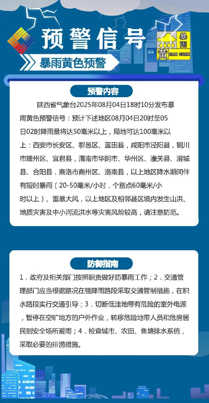 陝西省氣象台2025年08月04日18時10分發布暴雨黃色預警信號: