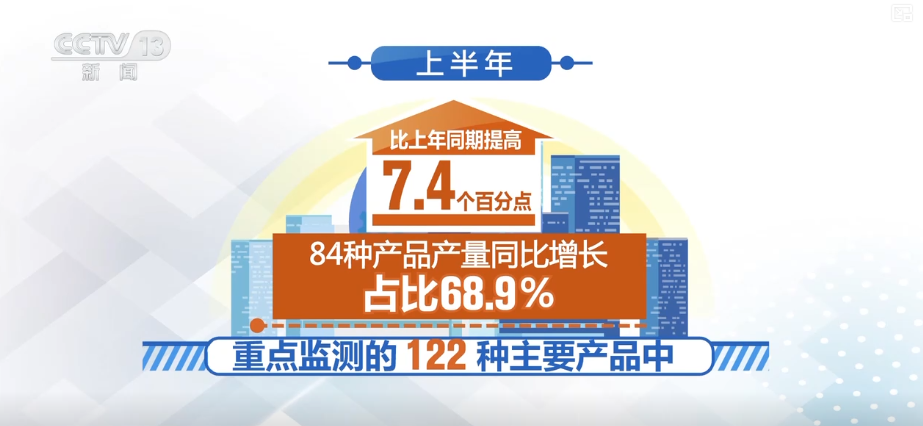 上半年,重點監測的122種主要產品中,84種產品產量同比增長,佔比68.9%,比上年同期提高7.4個百分點。