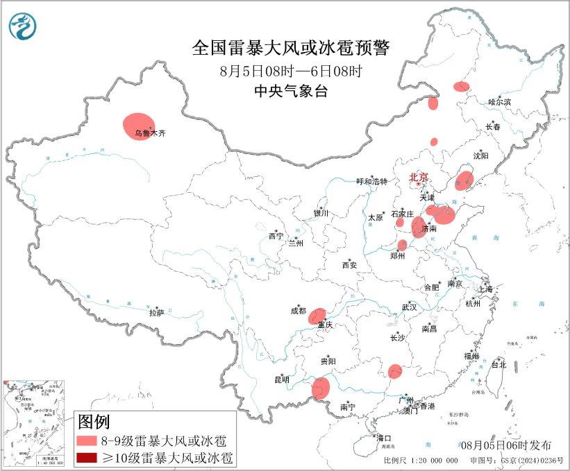 預計8月5日8時至6日8時,新疆西部、內蒙古東部、東北地區南部、華北南部、華中北部、華東北部、西南地區北部、華南西部和北部等地的部分地區將有8級以上雷暴大風或冰雹天氣。