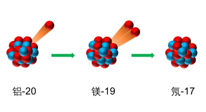 該研究中,科研人員基於德國亥姆霍茲重離子研究中心的碎片分離器裝置,利用飛行中衰變實驗技術測量了鋁-20衰變產物(即三個質子與剩餘核氖-17)的角關聯,首次觀測到新核素鋁-20的三質子發射現象。鋁-20位於質子滴線外,比自然界穩定存在的鋁同位素少7箇中子,是迄今為止實驗上發現的最輕的鋁同位素。進一步的研究表明,鋁-20基態通過級聯的質子—雙質子發射的兩步過程進行衰變。作為中間態的鎂-19基態具有雙質子放射性,它通過同時發射兩個質子衰變為氖-17。鋁-20是實驗上發現的首例具有“子核”雙質子放射性的三質子發射核。