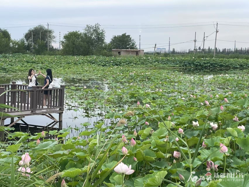 遊客在瑪納斯縣蘭州灣鎮八家户村荷塘遊玩。石榴雲/新疆日報記者 姚剛攝