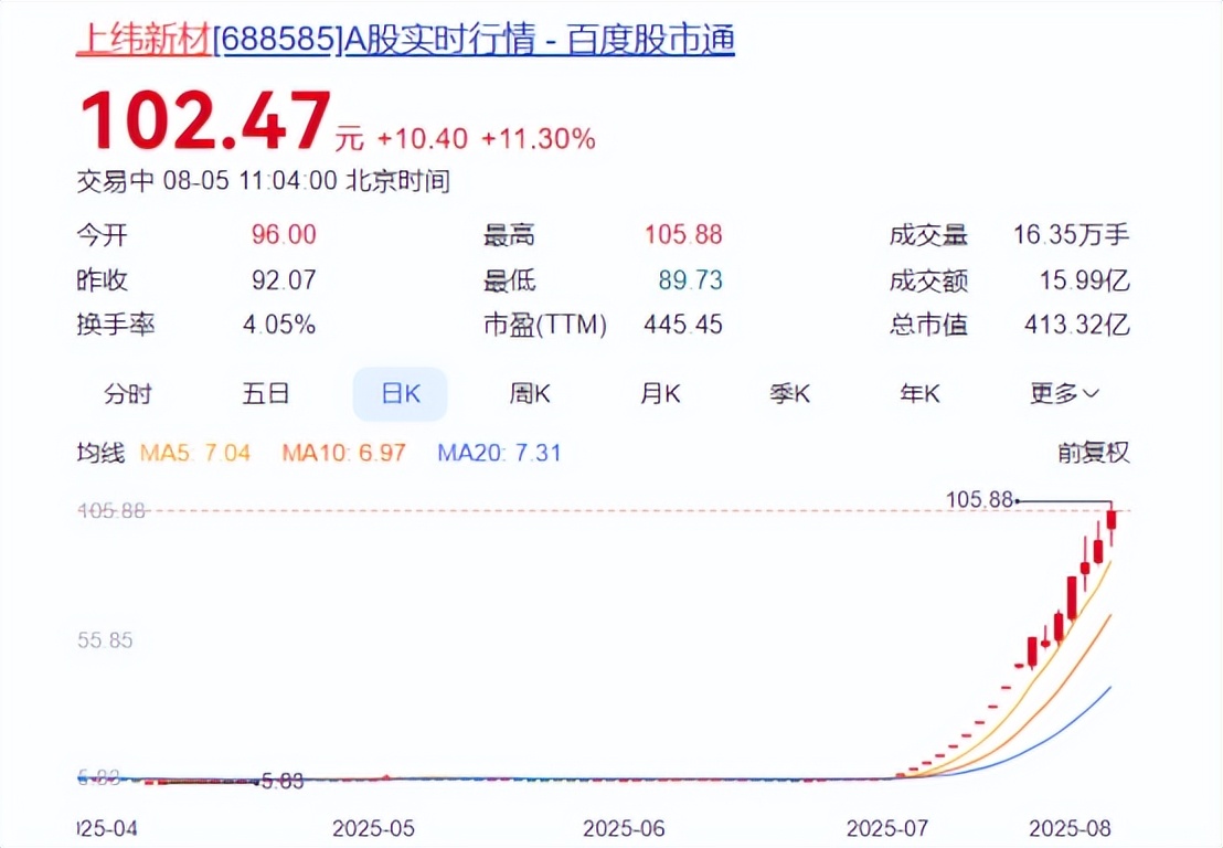 【環球網財經綜合報道】8月5日,上緯新材股票開市起復牌,此前其股價突破百元大關,一度達105.88元/股,創歷史新高,截至發稿報102.75元/股,上漲11.6%,總市值414.45億元,年內漲幅超1400%,成為2025年A股首隻10倍股。
