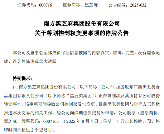 【環球網消費綜合報道】食品企業黑芝麻(000716)8月4日發佈公告稱,其控股股東廣西黑五類食品集團有限責任公司(以下簡稱“黑五類集團”)正在籌劃一項可能導致公司控制權變更的重大事項。公司股票自當日起停牌,預計停牌時間不超過2個交易日。