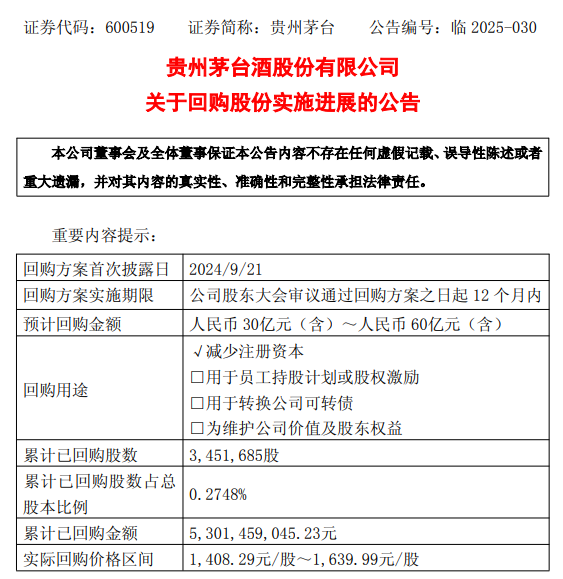 【環球網消費綜合報道】8月5日,貴州茅台(600519)發佈公告,披露了其股份回購計劃的最新進展。截至2025年7月底,公司已累計回購股份345.17萬股,佔總股本的0.2748%,支付總金額高達53.01億元(不含交易費用)。這筆鉅額資金將用於註銷股份並減少註冊資本,此舉被市場解讀為貴州茅台在行業調整期,向外界傳遞長期價值與堅定信心的強烈信號。
