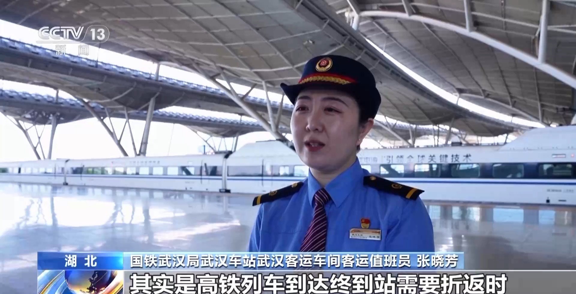*國鐵武漢局武漢車站武漢客運車間客運值班員 張曉芳:*列車的“變臉”,其實是高鐵列車到達終到站需要折返時,通過這種燈光的變化,向我們站台的工作人員傳遞出本趟列車即將進行換端作業的視覺語言,也就是我們常説的高鐵要“調頭”了。