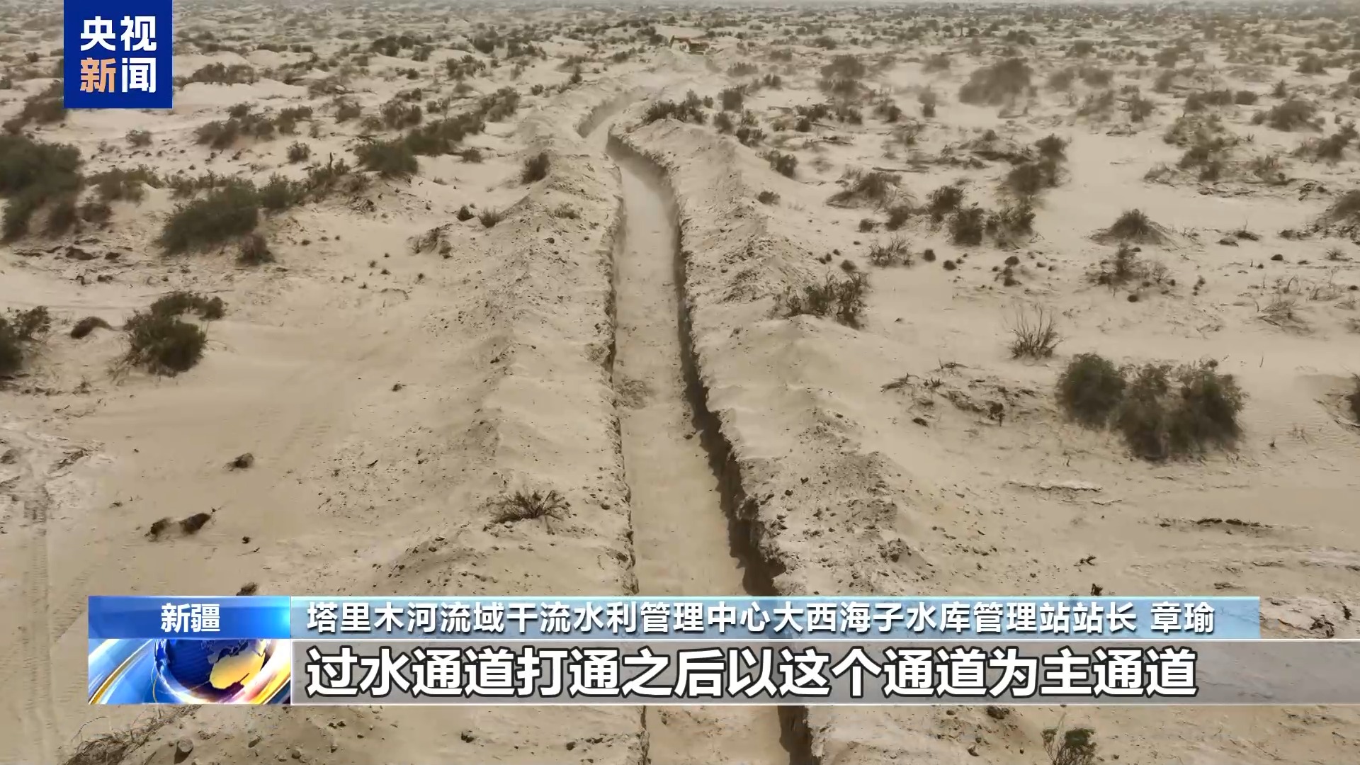 塔里木河流域幹流水利管理中心大西海子水庫管理站站長章瑜介紹,這是他們今年新開挖的一個過水通道,打通之後以這個通道為主通道,每間隔一公里到兩公里開挖它的毛細通道。這樣就橫向地擴大了它的受水面積,有效地保證這一片區域的植被用水。
