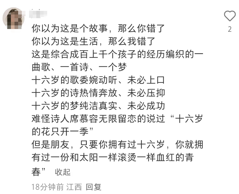 “你以為這是故事,那麼你錯了。你以為這是生活,那麼我錯了。這是綜合成千上萬個十六歲的孩子的經歷編織的一曲歌、一首詩、一個夢。”
