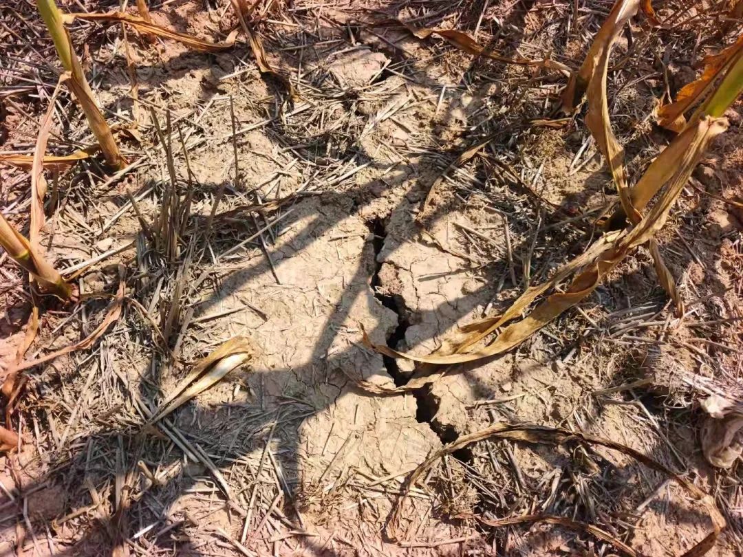 8月4日,周口市鄲城縣一位農户張先生告訴九派新聞,今年他種了四五十畝地,主要作物有花生、玉米和中藥材,五月播種後,到現在兩個多月一直沒怎麼下過雨,只能靠人工用井水澆灌田地,一些沒澆過的地塊旱得發裂,裂縫可達五六釐米寬。