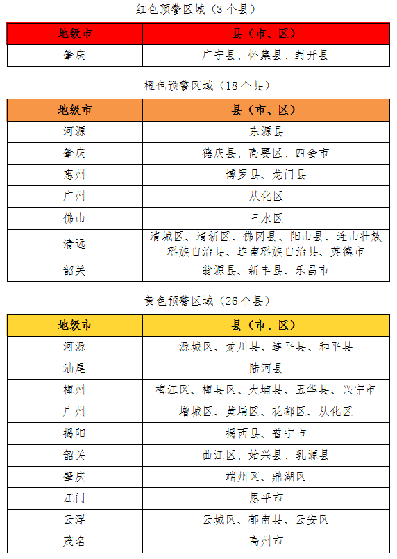 河源源城區、龍川縣、連平縣、和平縣,汕尾陸河縣,梅州梅江區、梅縣區、大埔縣、五華縣、興寧市,廣州增城區、黃埔區、花都區、從化區,揭陽揭西縣、普寧市,韶關曲江區、始興縣、乳源縣,肇慶端州區、鼎湖區,江門恩平市,雲浮云城區、鬱南縣、雲安區,茂名高州市,局地發生山洪災害可能性較大(黃色預警)。