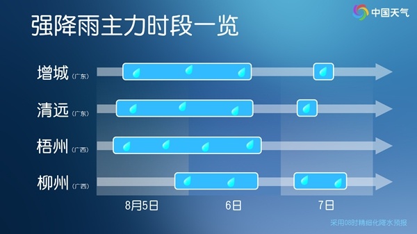 城市中,廣東的清遠、增城和廣西梧州等地今明天仍處降雨核心影響時段,其中清遠今天有暴雨轉大暴雨,增城和梧州或現大雨到暴雨;廣西柳州核心降雨時段為明後天,將遭大雨侵襲。