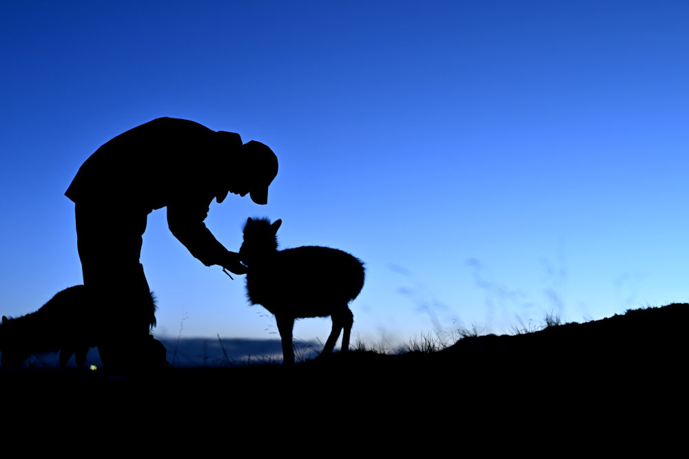可可西里管理處索南達傑保護站,巡山隊員與被救助的藏羚羊幼仔在一起。新華社記者 張宏祥 攝