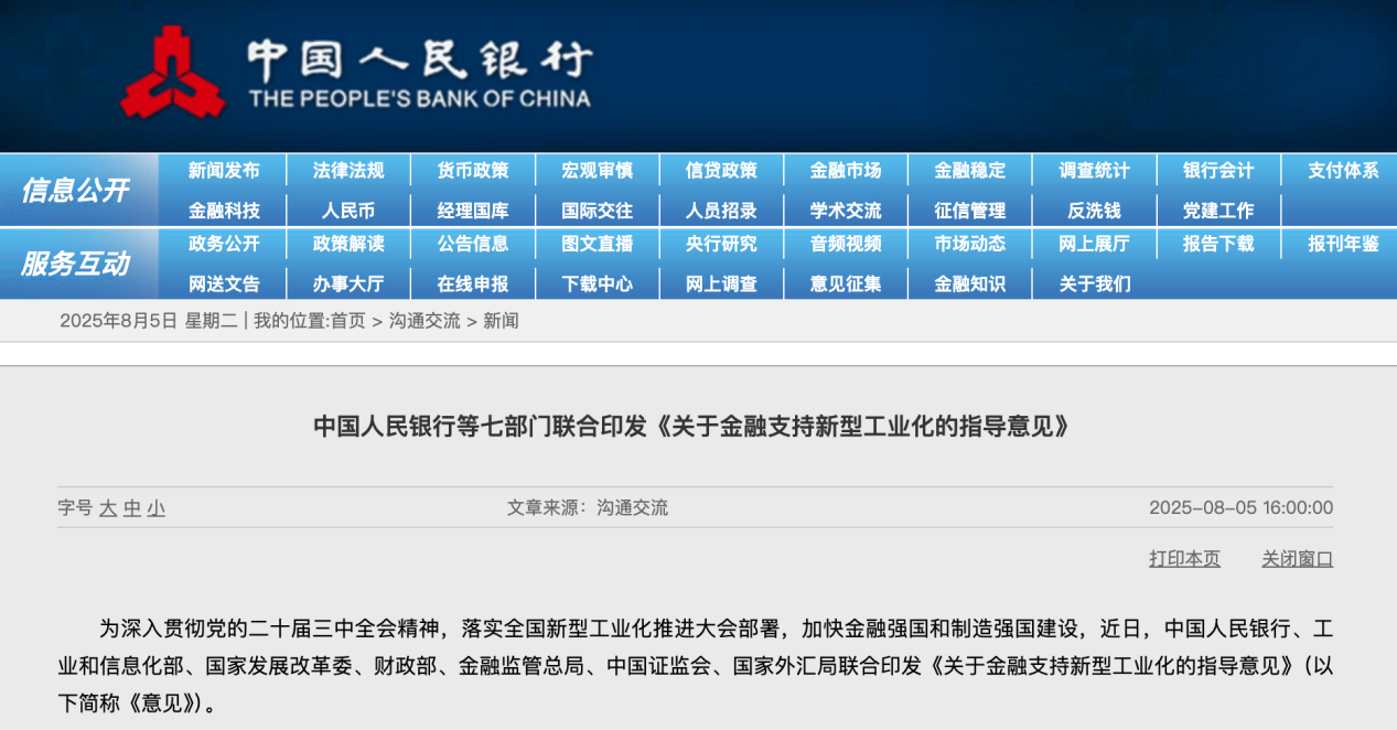 【環球網財經綜合報道】8月5日,人民銀行等七部門聯合印發《關於金融支持新型工業化的指導意見》(以下簡稱《指導意見》),提出為推進新型工業化、加快發展新質生產力提供高質量金融服務,堅持分類施策、有扶有控,推動產業加快邁向中高端,防止“內卷式”競爭。