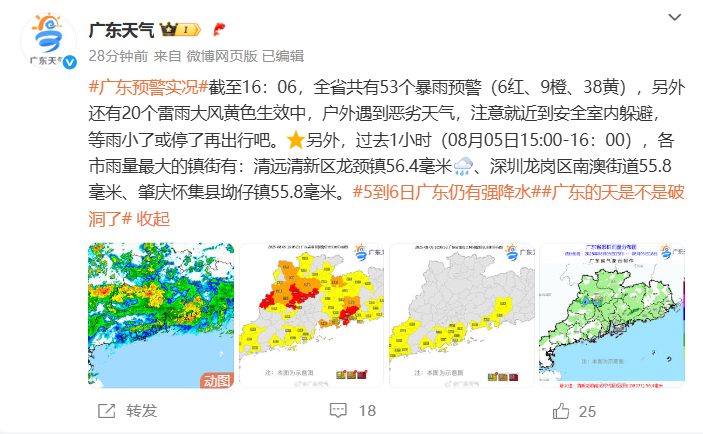 截至16:06,廣東省共有53個暴雨預警(6紅、9橙、38黃),另外還有20個雷雨大風黃色生效中。
