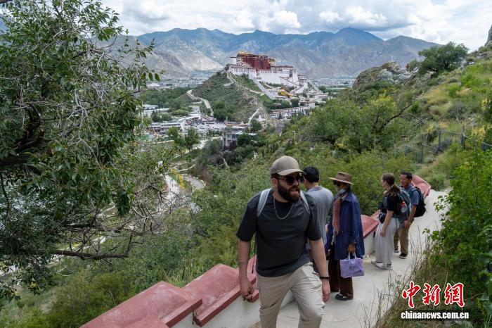 8月4日,外籍遊客登上拉薩團結公園藥王山步道。中新社記者 江飛波 攝