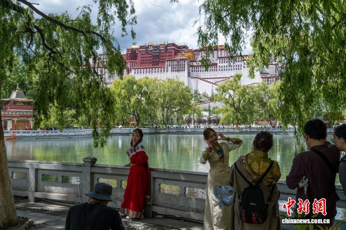 7月29日,遊客在布達拉宮廣場東側人工湖附近“打卡”。中新社記者 江飛波 攝