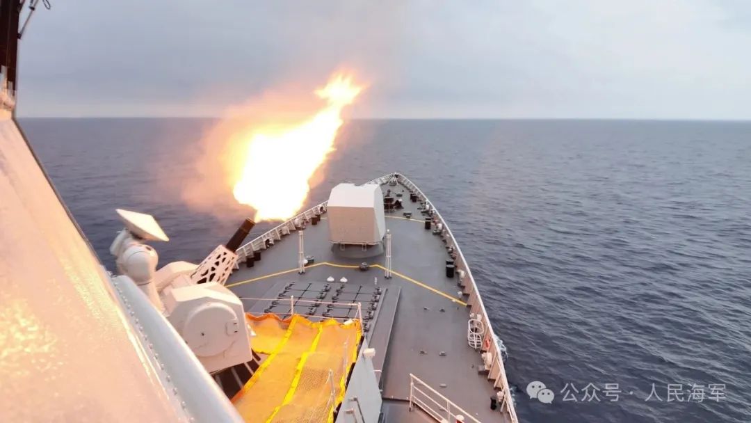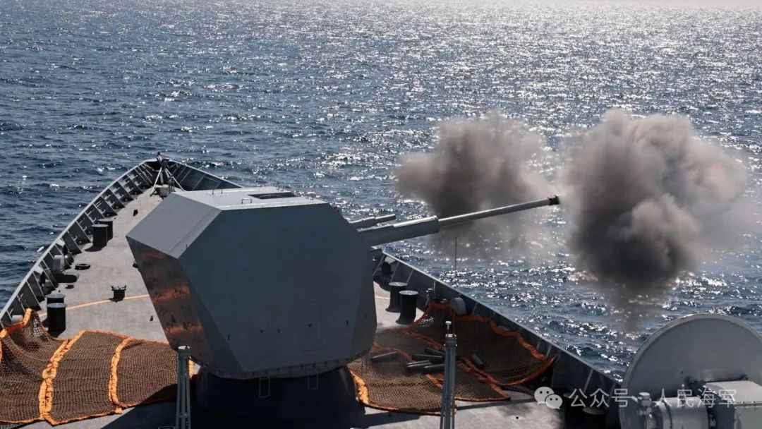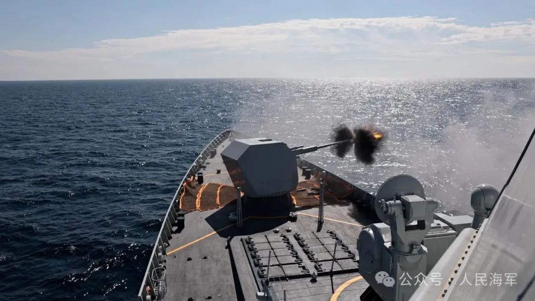 ▲8月3日,中俄艦艇編隊開展聯合防空科目訓練,烏魯木齊艦進行副炮射擊。 王可 攝