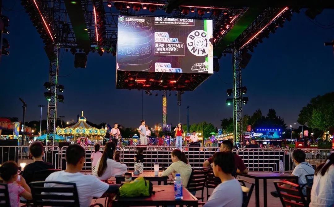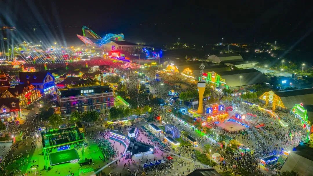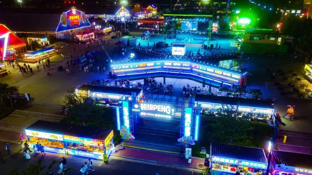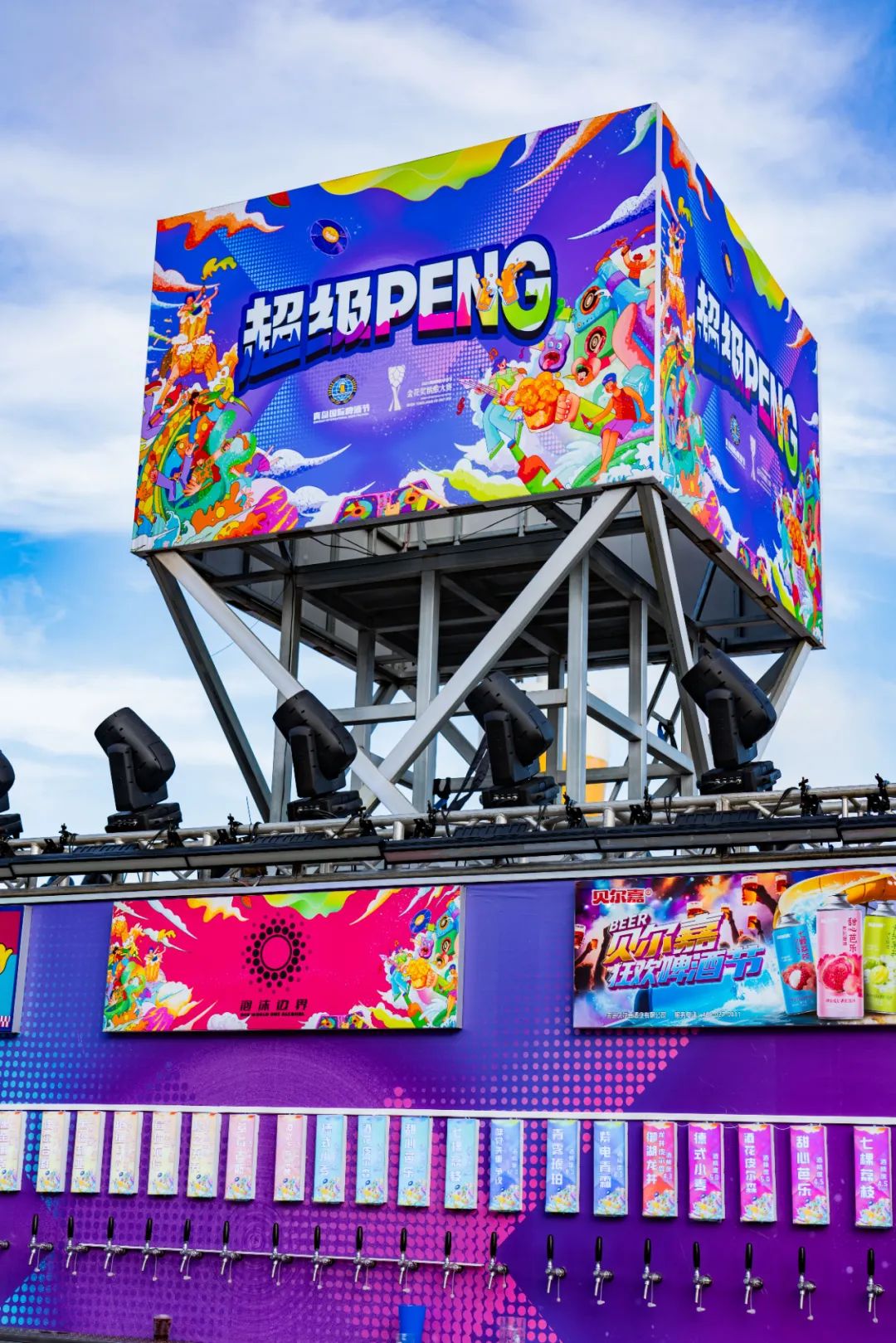 當夜幕降臨,“超級PENG”酒牆在燈光的映照下愈發閃耀,成為整個廣場的焦點。周圍的綠頂帳篷下,坐滿了舉杯暢飲的人們,歡聲笑語此起彼伏。