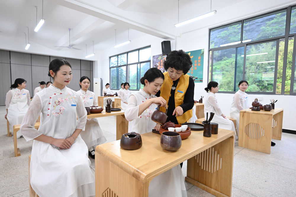 2025年5月8日,福建省武夷山旅遊職業中專學校的茶藝老師在教授茶藝。近年來,武夷山市依託當地茶產業優勢,持續推進茶文化、茶技能教育走進校園,在當地職業學校重點開設了茶藝、茶葉加工、茶營銷等專業,為當地茶產業發展、茶文化傳播培養職業技能人才。