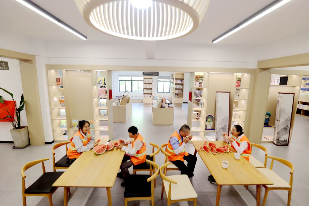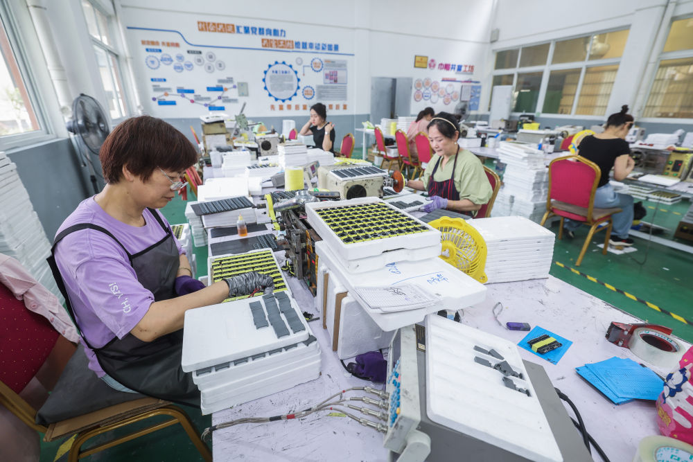 2025年6月19日,村民在浙江省海寧市鹽官鎮桃園村紅“芯”共富工坊內工作。該共富工坊針對有靈活就業需求的低收入村民,採用“靈活就業+固定用工”彈性用工方式,促進羣眾就業增收。