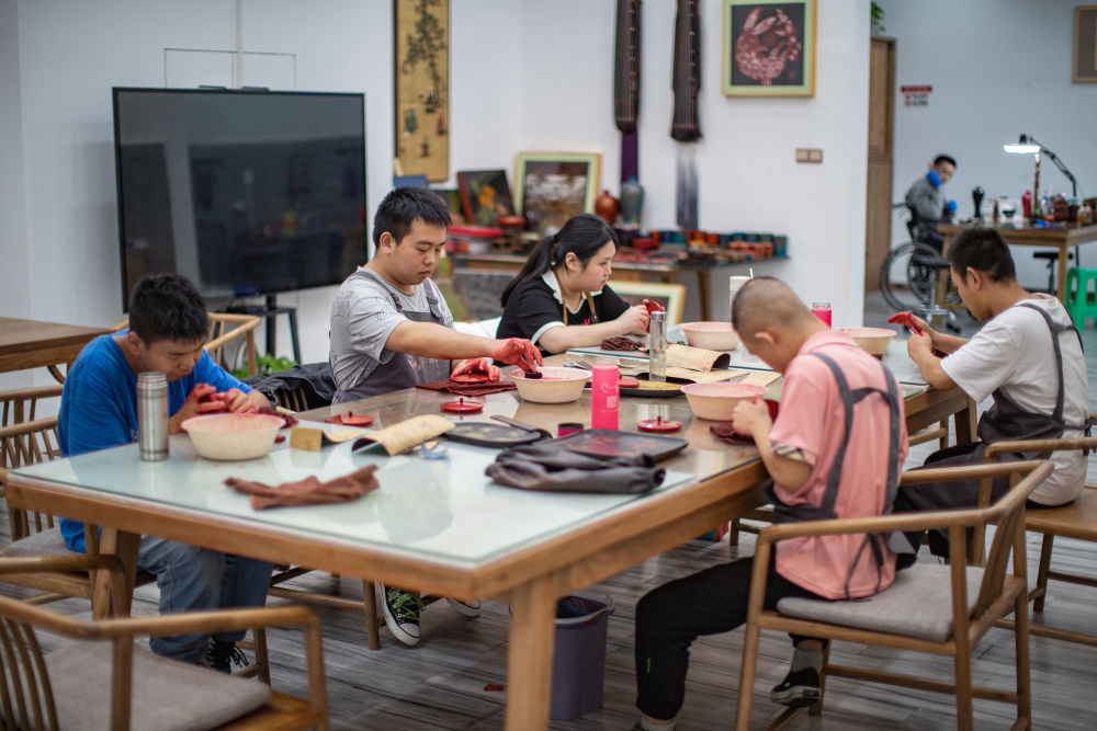 2023年9月18日,在重慶市城口縣的“忘我”大漆藝術空間,殘障員工打磨漆器產品。“忘我”大漆藝術空間集殘疾人漆藝培訓、輔助性就業、職業康復、日間照料等功能於一體,利用當地的大木漆資源,組織殘疾人創作漆器產品。
