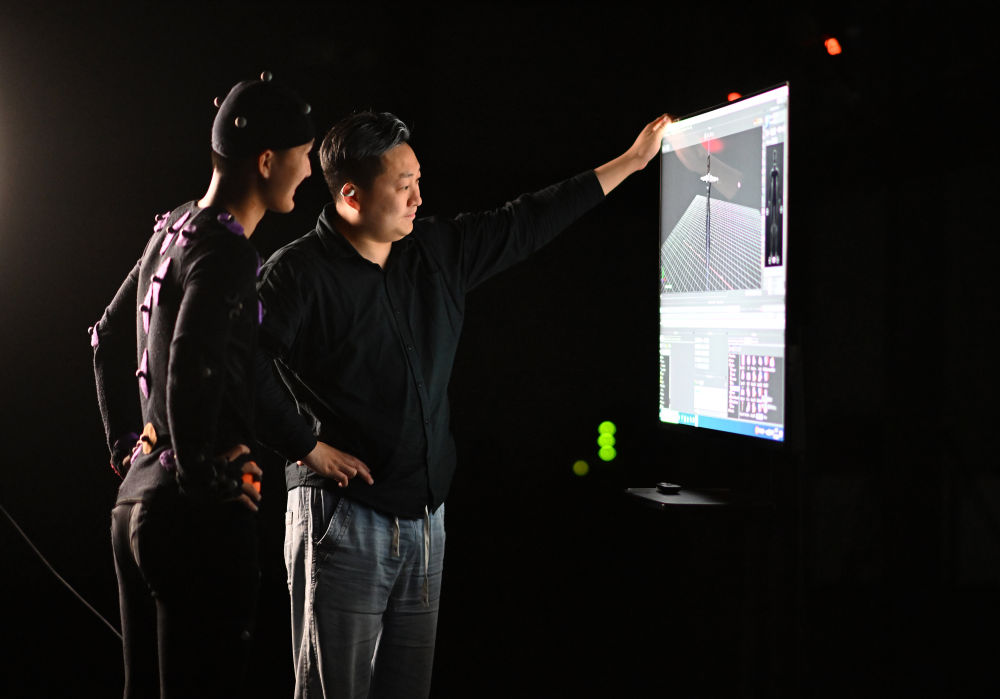 2024年4月23日,在位於天津市濱海新區國家動漫園裏的大型動作捕捉棚內,技術顧問崔盛輯(右)和動捕演員馬鑫琪查看電腦生成的虛擬角色動作。人社部近年公佈的新職業中,數字孿生應用技術員名列其中。崔盛輯正是一名數字孿生應用技術員。他從事數字技術相關工作多年,如今已成立了工作室,主要通過數字孿生技術搭建在影視動畫、沉浸式文旅、生命科學等領域的應用場景。