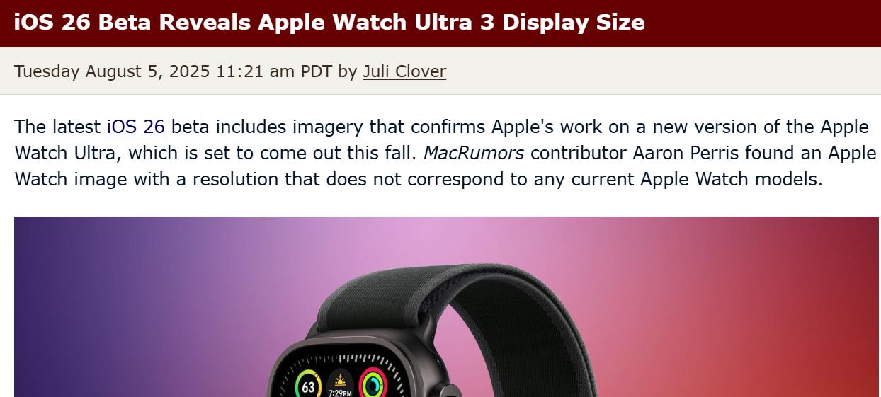 【環球網科技綜合報道】8月6日消息,據外媒macrumors報道,最新 iOS 26 測試版中包含的圖片證實了新款 Apple Watch Ultra 3 的開發進度。這款備受期待的智能手錶預計將於今年秋季正式發佈。