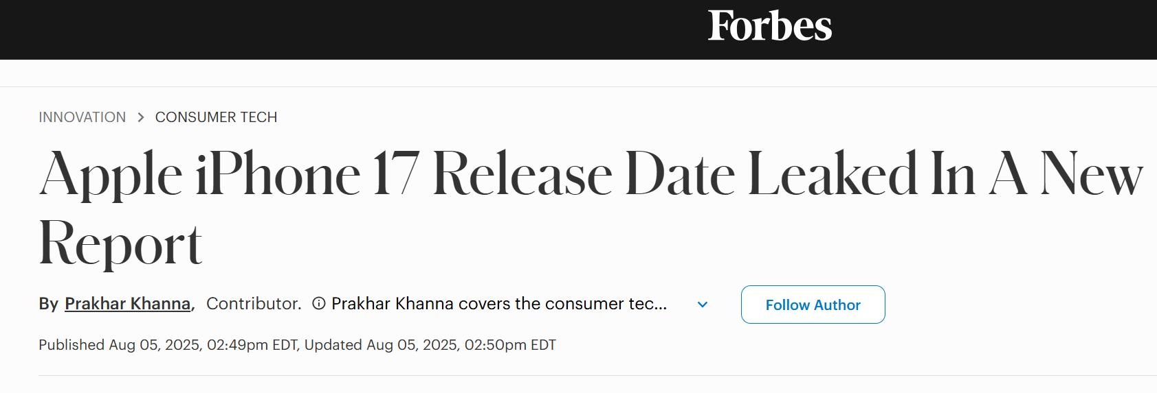 【環球網科技綜合報道】8月6日消息,據forbes援引iPhone-Ticker報道,蘋果公司將於 9 月 9 日舉辦 iPhone 17 系列發佈會,與 iPhone 16 的發佈日期一致。這一消息得到了至少一家當地運營商內部文件的證實,預示着蘋果秋季發佈會進入倒計時。