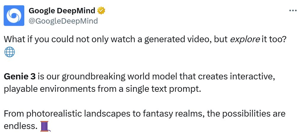 外媒:谷歌DeepMind宣佈推出新一代世界模型Genie 3
