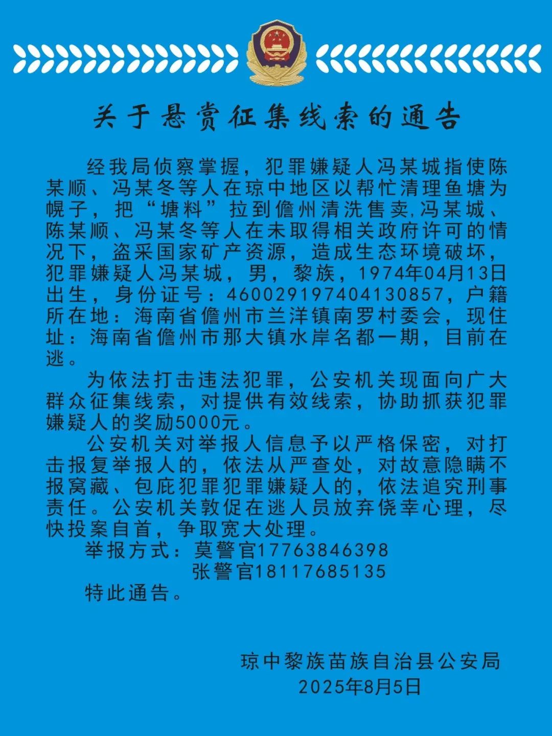 經我局偵察掌握,犯罪嫌疑人馮某城指使陳某順、馮某冬等人在瓊中地區以幫忙清理魚塘為幌子,把“塘料”拉到儋州清洗售賣,馮某城、陳某順、馮某冬等人在未取得相關政府許可的情況下,盜採國家礦產資源,造成生態環境破壞,犯罪嫌疑人馮某城,男,黎族,1974年04月13日出生,身份證號:460029197404130857,户籍所在地:海南省儋州市蘭洋鎮南羅村委會,現住址:海南省儋州市那大鎮水岸名都一期,目前在逃。