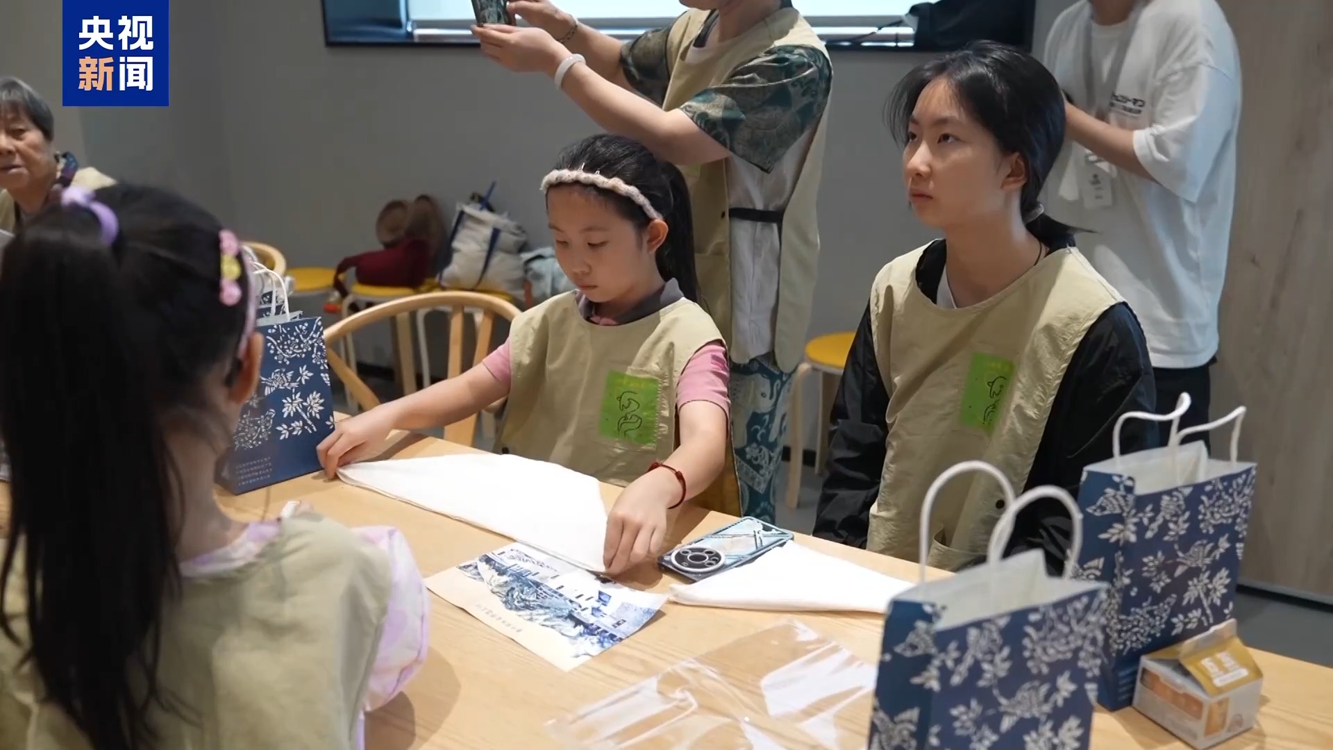 這個暑假,在浙江省非物質文化遺產館的非遺互動體驗區,孩子們繫着圍裙,專注地跟着非遺傳承人學習靛青白花印染技藝。由於捆紮的鬆緊不同,每一塊扎染作品都是獨一份的藝術品。